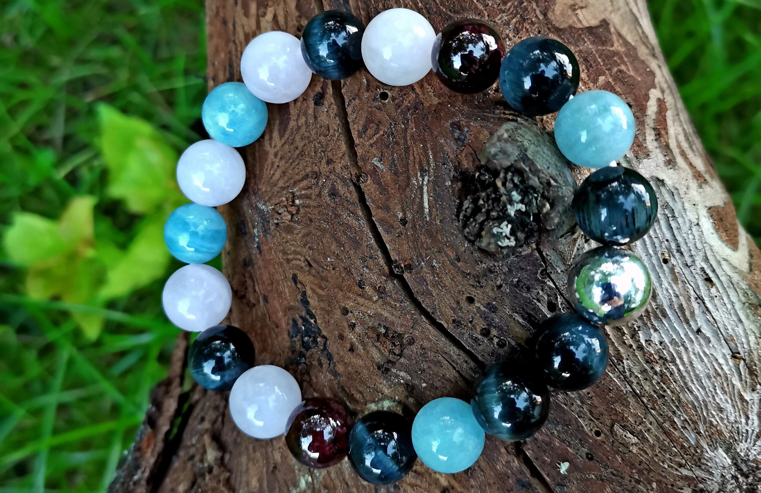 На тему поиска компромиссного решения в сложной ситуации. Камни: аквамарин, соколиный глаз, кварц, гранат.